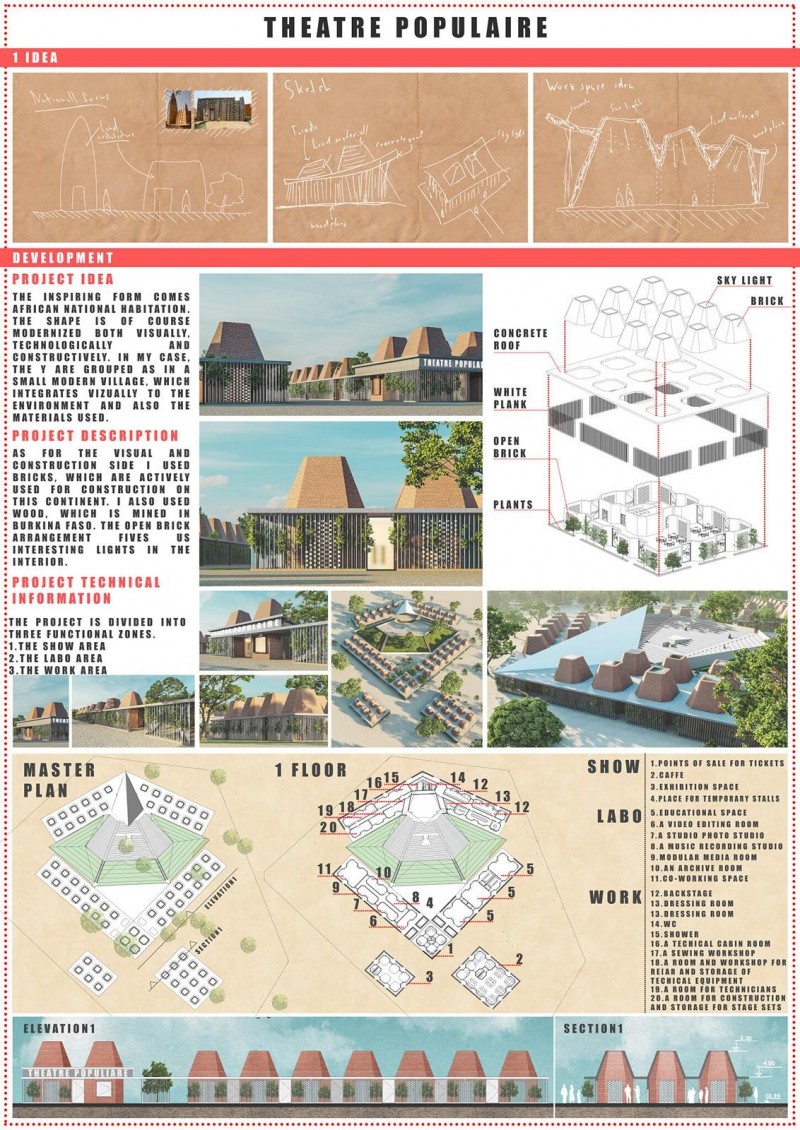 INSPIRATIONrnThe inspiring form comes from the African national habitation. The shape is of course modernized both visually, technologically and constructively.rnDESCRUPTIONrnIn my case, they are grouped as in a small modern village, which integrates visually to the environment and also the materials used. The forms are joined together by a concert. The separate form itself is a modernized and sophisticated version of the national dwelling. The structure form comes also from Africa. Their people and settlements, side by side. Taken in one form, which resembles their old dwelling, it is repeated many times as a small village, but at the same time quite modern as visually technically and structurally. The plan consists of three separate but somewhat related spaces. A show space that can be found at the entrance with a cafeteria, meeting rooms, ticket sales and handmade accessories venues. To the right and left of its axis is a labo space 4 with educational halls, in the middle of which chairs and small greenery create an environment for young people to sit and relax. The back of the stage is entirely dedicated to the workspace with backstage, bathrooms, dressing rooms, etc. rnTECHNICAL INFORMATIONrnThe structure is built entirely of open bricks, concrete and metal rods.rn