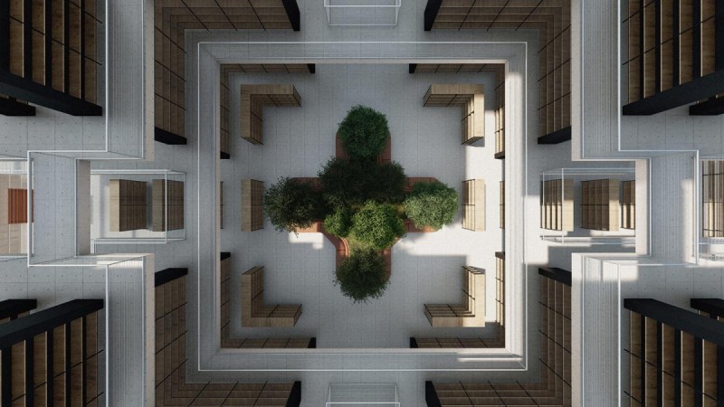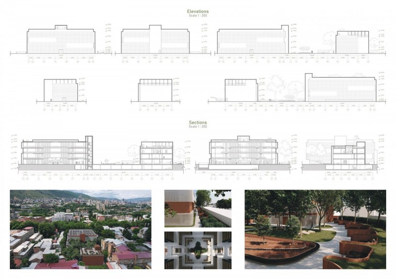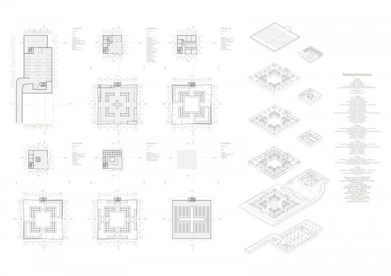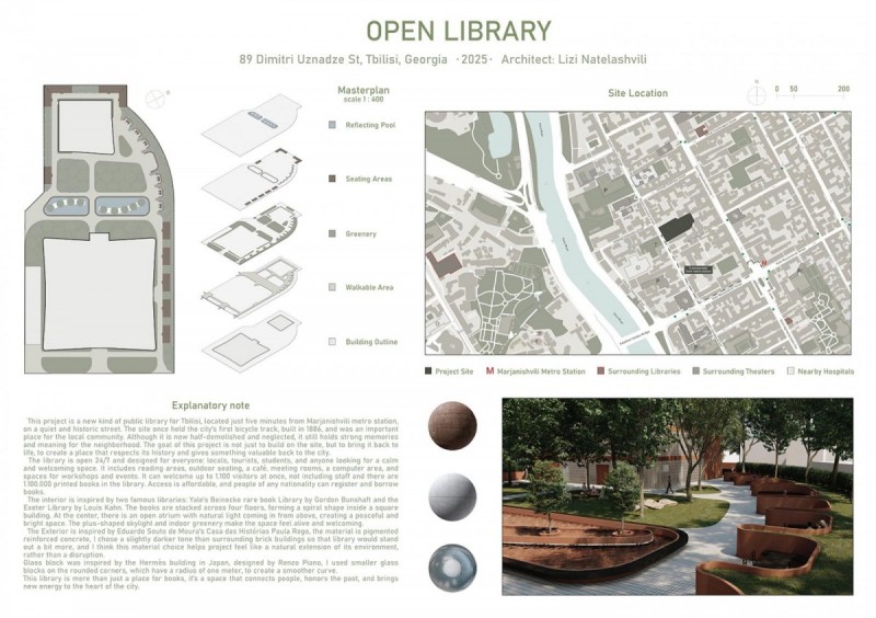 This project is a new kind of public library for Tbilisi, located just five minutes from Marjanishvili metro station, on a quiet and historic street. The site once held the city’s first bicycle track, built in 1886, and was an important place for the local community. Although it is now half-demolished and neglected, it still holds strong memories and meaning for the neighborhood. The goal of this project is not just to built on the site, but to bring back to life, to create a place that reflects its history and gives something valuable back to the city. The library is open 24/7 and designed for everyone: locals, tourists, students, and anyone looking for a calm, welcoming space. It includes reading areas, outdoor seating, a café, meeting rooms, computer area, and spaces for workshops and events. It can welcome up to 1,100 visitors at once, not including staff, and there are over 1.1 million printed books in the library. Access Is affordable, and people of any Nationality can register and borrow materials. The interior is inspired by two famous libraries: Yale’s Beinecke Rare Book Library by Gordon Bunshaft and the Exeter Library by Louis Kahn. The books are stacked across four floors, forming a spiral shape inside a square building. At the center, there is an open atrium with natural light coming in from above, creating a peaceful and bright space. The plus shaped skylight and indoor greenery make the space feel alive and welcoming. The exterior is inspired by Eduardo Souto de Moura’s Casa das Historias Paula Rego, the material is pigmented reinforced concreate, I chose a slightly darker tone than surrounding brick buildings so that library would stand out bit more, and I think this material choice helps project feel like a natural extension of its environment, rather than a disruption. Glass block was inspired by the Hermes building in Japan, designed by Renzo Piano, I used smaller glass blocks on the rounded corners, which have a radius of 1 meter, to create a smoother curve. This library is more than just a place for books, it’s a space that connects people, honors the past, and brings new energy to the heart of the city.