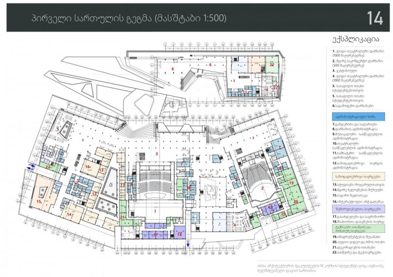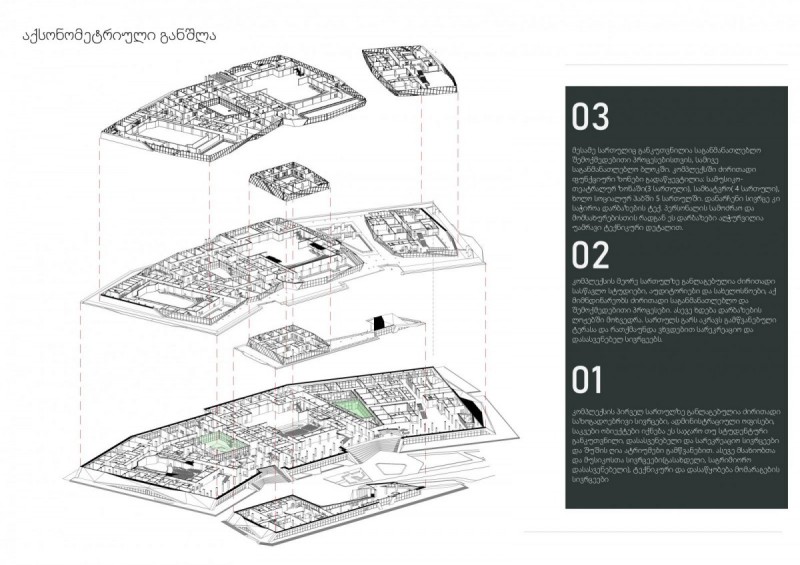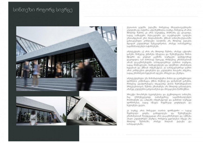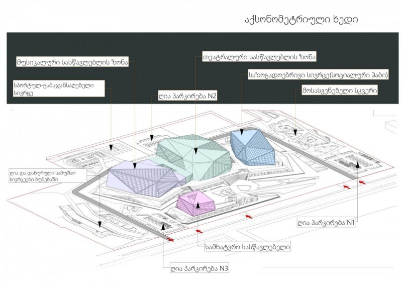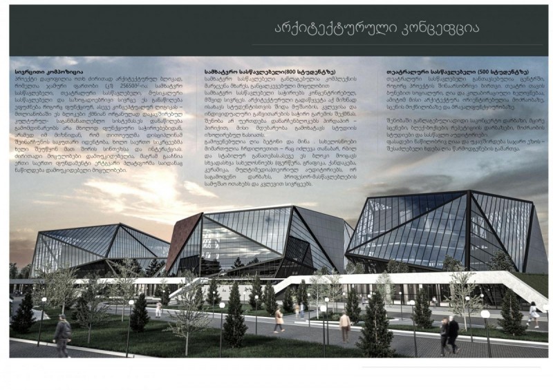 პროექტი წარმოადგენს კულტურულ-საგანმანათლებლო კომპლექსს, რომელიც აერთიანებს სამხატვრო, თეატრალურ და მუსიკალურ სასწავლებლებს, ასევე საზოგადოებრივ სივრცეებს. კომპლექსის მთავარი იდეაა სხვადასხვა სფეროს ხელოვნებისა და განათლების სინთეზი ერთ მთლიანობაში, რაც ქმნის ახალ შესაძლებლობებს სტუდენტებისთვის, მასწავლებლებისთვის და ფართო საზოგადოებისთვის. სამხატვრო სასწავლებელი გათვლილია უმაღლესი განათლების საფეხურზე და მოიცავს საგამოფენო, სახელოსნო და კვლევით ლაბორატორიებს, სადაც სტუდენტებს შესაძლებლობა აქვთ არა მხოლოდ სწავლების, არამედ ექსპერიმენტებისა და ახალი იდეების განვითარებისთვის. მუსიკალურ-თეატრალური ნაწილი აერთიანებს სასწავლო აუდიტორიებს, საკონცერტო და საკონფერენციო სივრცეებს, რეპეტიციისა და რისკენული დარბაზებს, რაც ხელს უწყობს თანამედროვე საგანმანათლებლო და შემოქმედებით პროცესებს. საზოგადოებრივი სივრცეები პროექტის განუყოფელი ნაწილია: ინტერაქტიური არტ-გალერეა, Projection Mapping, AR/VR და სენსორული ტექნოლოგიები, რომლებიც თანამედროვე ინტერპრეტაციით აცოცხლებს ქართულ კულტურას. კომპლექსი იქცევა როგორც განათლების, ისე