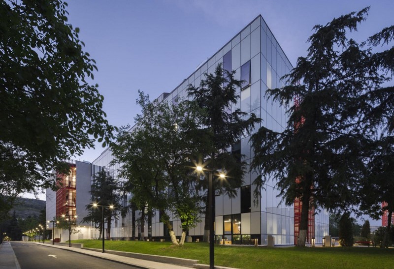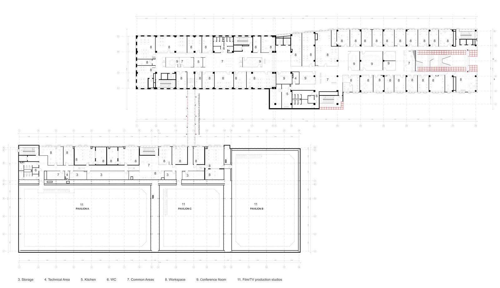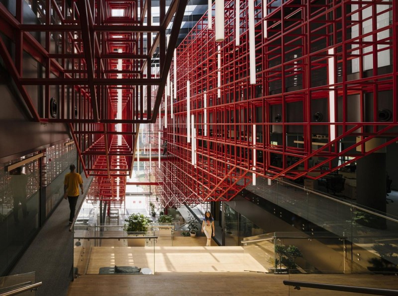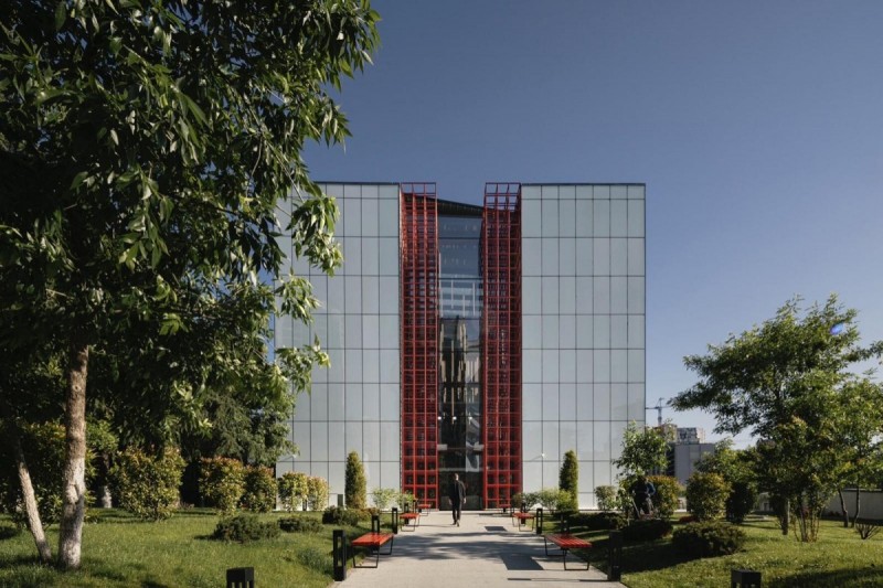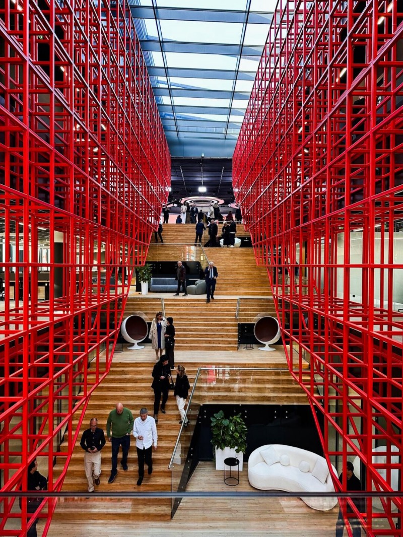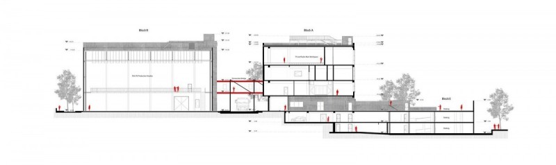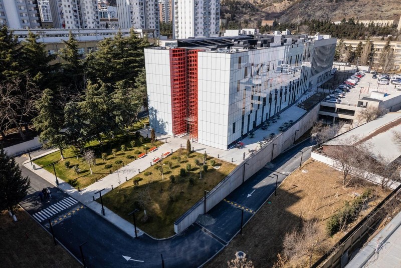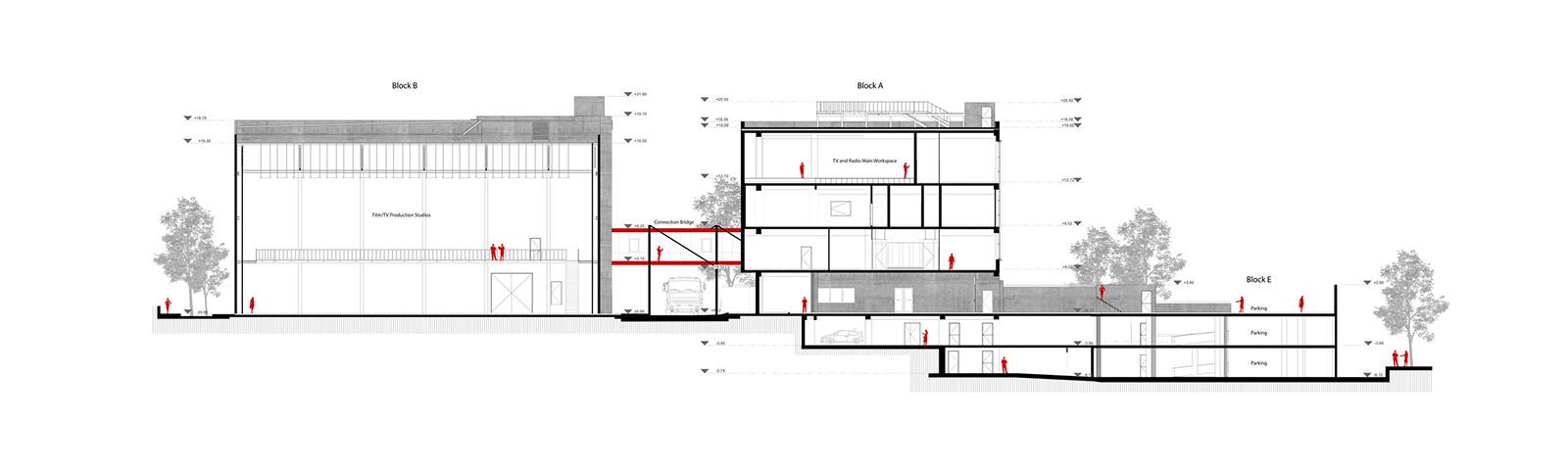 Credits: Tbilkalakproeqti Ltd Acoustic Engineer: Akustiko LLC MEP: Casa Calda LLC Structural Engineer: Capiteli Ltd Construction: Dagi Ltd Project Management: CMC Ltd Photo: Lasha Gigauri, David Bantsadze Tria Group has completed the new headquarters for the Georgian Public Broadcaster in Tbilisi — a bold, 27,918 m² media complex that redefines public broadcasting in Georgia. Conceived as a multifunctional workplace and production campus, the facility unifies television, radio, and digital infrastructure into a cohesive architectural statement grounded in transparency, adaptability, and civic presence. Project Overview The headquarters is organized into five interconnected blocks housing administration, newsrooms, recording studios, film pavilions, post-production zones, specialized technical infrastructure, and archival storage. At its core lies a dramatic atrium framed in red steel — a civic heart that symbolizes openness and institutional transparency. Glazed walkways and a central staircase weave together departments, encouraging collaboration and cross-disciplinary exchange. Each block operates autonomously yet maintains seamless internal connectivity, ensuring workflow continuity and creative synergy. Abundant daylight, visual openness, and spatial clarity reinforce the project’s design ethos. The façades, articulated in red, white, and grey, express dynamism and lightness, while red functions as a brand-defining signature anchoring the building in its urban context. Program highlights: Block A: Administration, newsroom, radio studios, theatre, and central control room Block B: Four film/TV pavilions (1,000 m², 700 m², 500 m², and 200 m²) Block C: Film, video, and audio archives in climate-controlled conditions Block D: Technical infrastructure — server rooms, editing suites, and workshops Block E: Parking for staff, guests, and logistics. Technical + Acoustic Strategy A central challenge was integrating advanced broadcast infrastructure within a unified architectural framework. Studios and control rooms demanded rigorous acoustic insulation, vibration isolation, electromagnetic shielding, and precise climate control. These were achieved through modular planning, specialized detailing, and close collaboration with consultants. Each studio is structurally independent, with no rigid wall, floor, or ceiling connections. Acoustic dampers, isolated mechanical penetrations, and dual-glazed barriers prevent sound transfer, while buffer zones between clusters safeguard uninterrupted broadcast operations. Civic + Environmental Role Beyond technical performance, the building fosters openness, accessibility, and institutional unity. Step-free circulation and ergonomically designed workspaces ensure inclusivity, while shared civic spaces — including the atrium and indoor/outdoor recreational zones — promote cross-departmental engagement. Sustainability measures, such as high-performance insulation and reduced energy demand, provide long-term efficiency and environmental benefits. A Landmark for Independent Media More than a production hub, the Georgian Public Broadcaster headquarters stands as a cultural landmark. It embodies transparency, resilience, and the democratic role of independent media. By supporting collaboration, accessibility, and civic trust, it reflects a progressive vision for public broadcasting in Georgia.