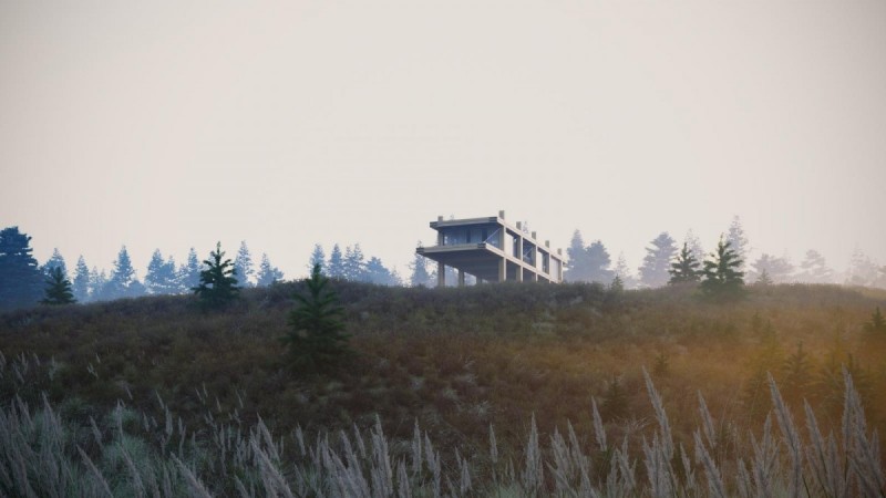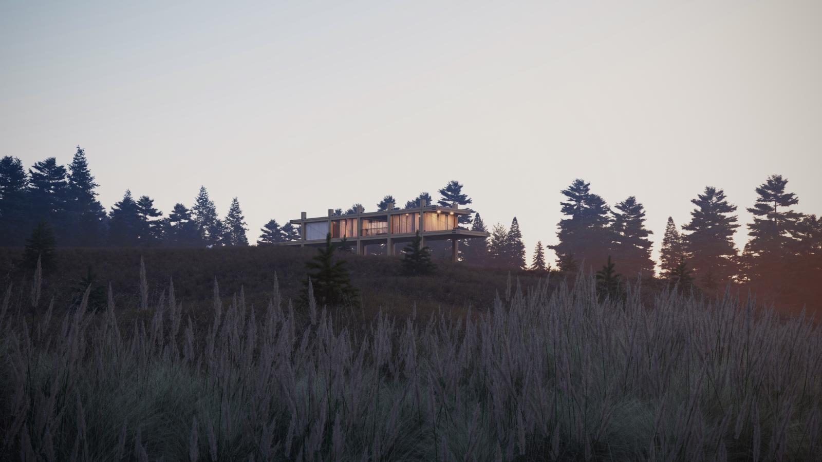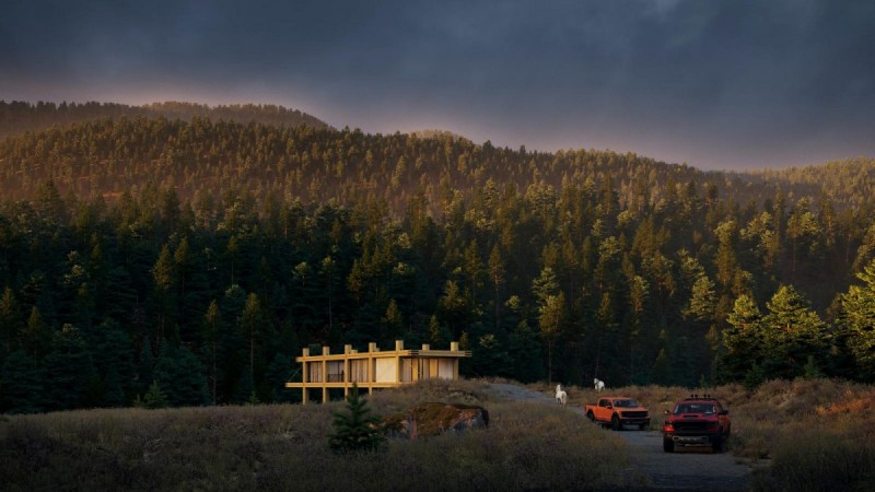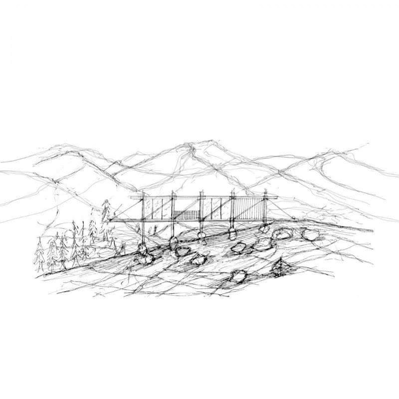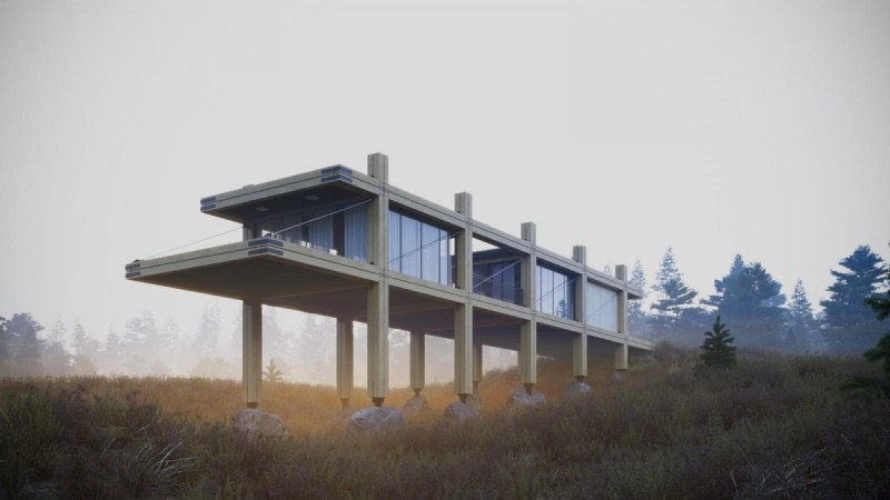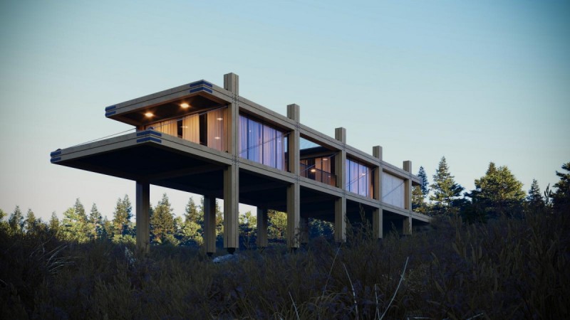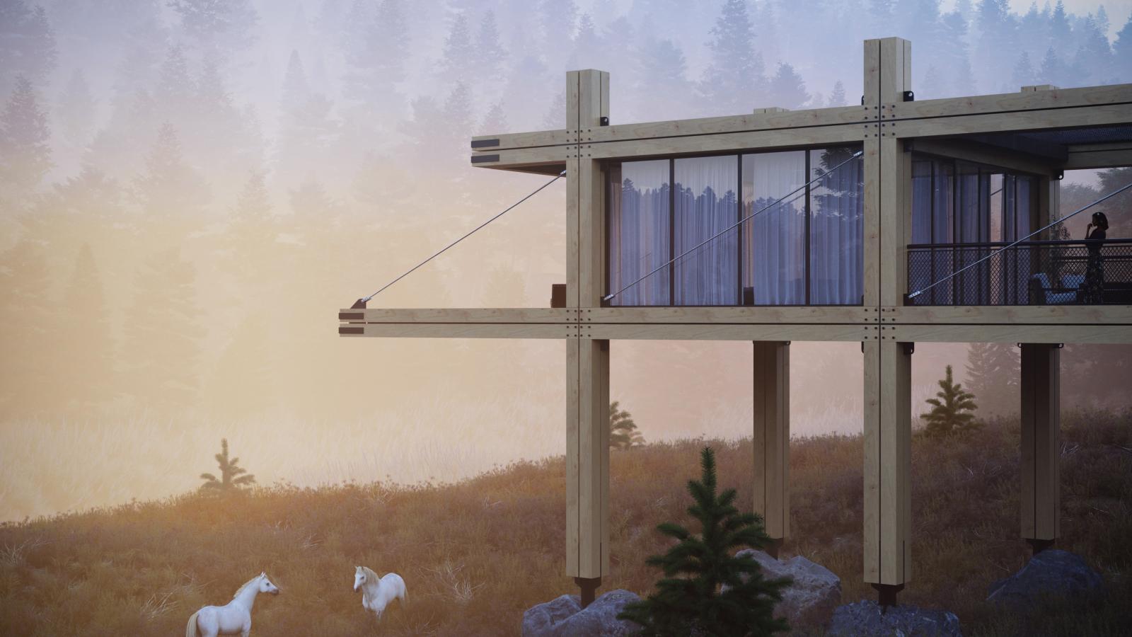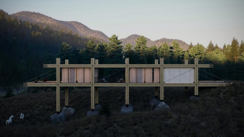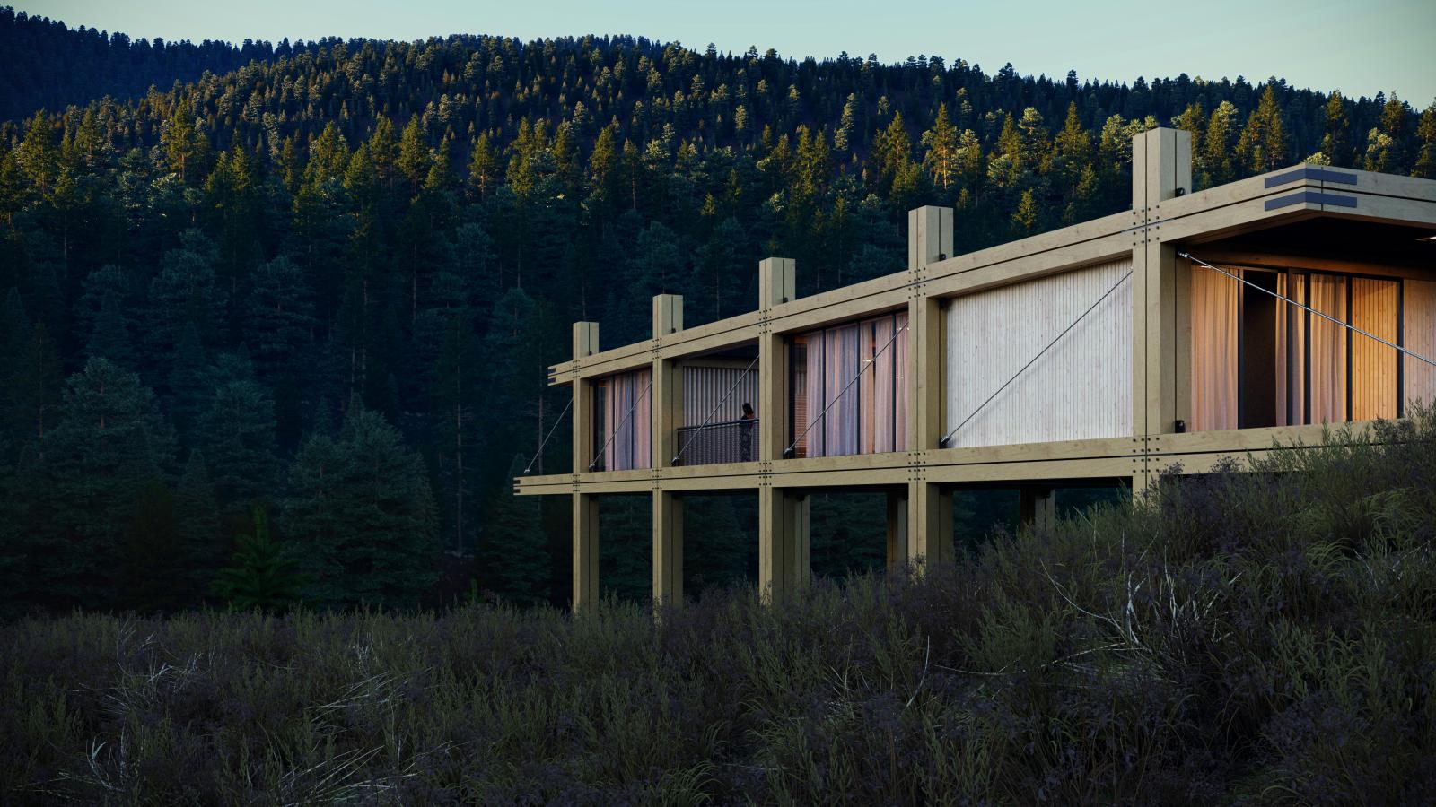Minimalist timber structure set in a mountainous pine forest. Using a modular post-and-beam system, the building is elevated on slender wooden columns resting on natural stone footings. The design balances lightness with structural clarity, blending modern form with traditional techniques. Large glass panels open the interior to the landscape, while metal tension cables support cantilevered elements, adding a sense of engineered elegance. The structure minimizes site impact, hovering lightly above the terrain and embracing the natural slope