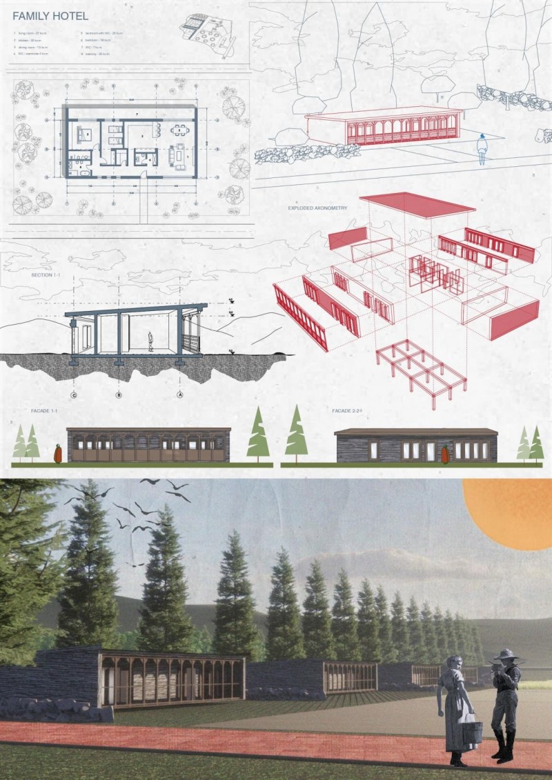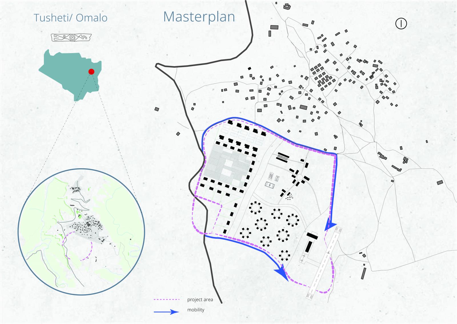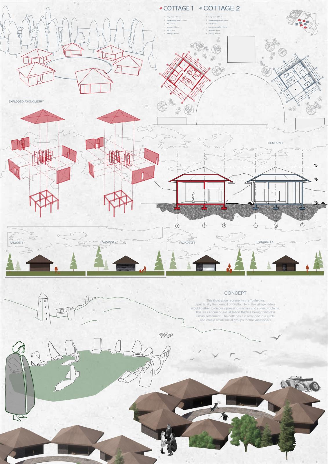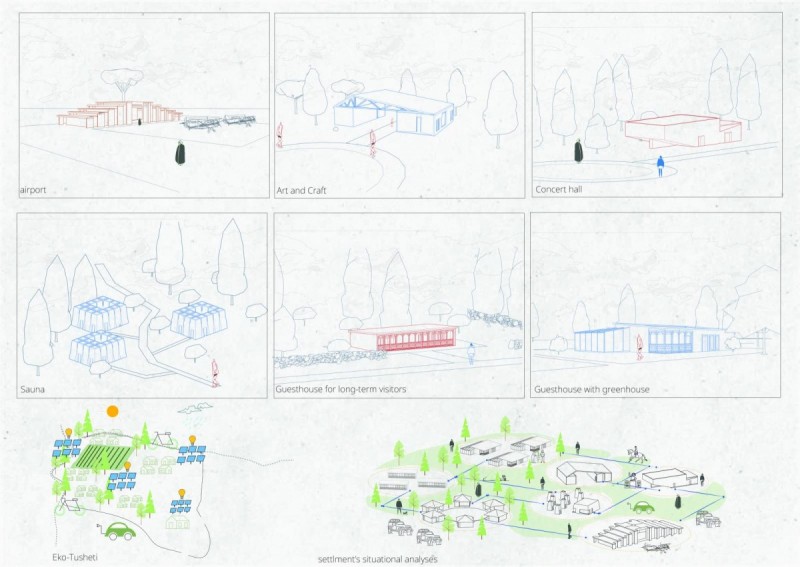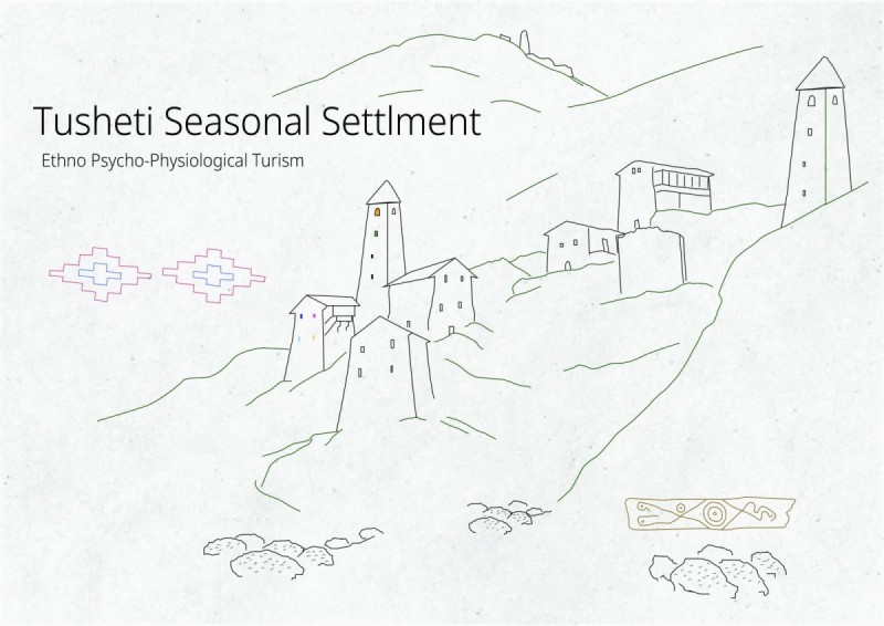 Tusheti Seasonal Settlement (Ethno Psycho-Physiological Tourism) This is a bachelor’s project, the idea of which initially arose from observing the challenges currently facing the mountains and the depopulation of mountainous regions. Tusheti, one of Georgia’s most beautiful and remote regions, where permanent residents are now nearly gone due to harsh climatic and other environmental factors, provided an excellent foundation for an interesting project. At the beginning of the research, the village of Omalo was chosen, as it is the center of Tusheti and was originally intended to host an airport whose construction had started but was never completed. This unfinished airport subsequently became the cornerstone of our bachelor’s project, around which the settlement was developed with various new functions. The seasonal settlement offers not only tourists a unique opportunity to experience the local culture and way of life but also benefits the local Tusheti population. Residents will be able to return to their land without fear of complete isolation during the winter. The project aims to complete the unfinished airport in Omalo and establish cultural and educational facilities, such as an assembly hall, an art and exhibition space, wellness centers including saunas, Pilates and yoga studios, and organized cycling tours (off-ride). Residential areas include: Cottages for short-term visitors; Family houses with greenhouses, allowing winter stays and crop cultivation; Long-term family homes, which include private plots for gardening, giving tourists or Georgian citizens a chance to escape urban chaos and reconnect with nature temporarily.