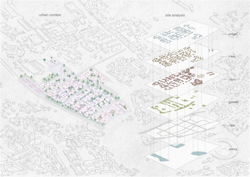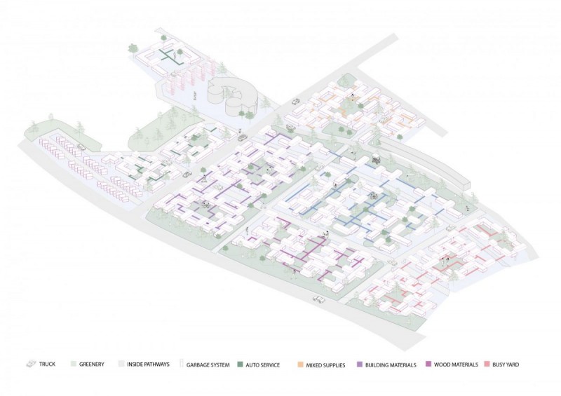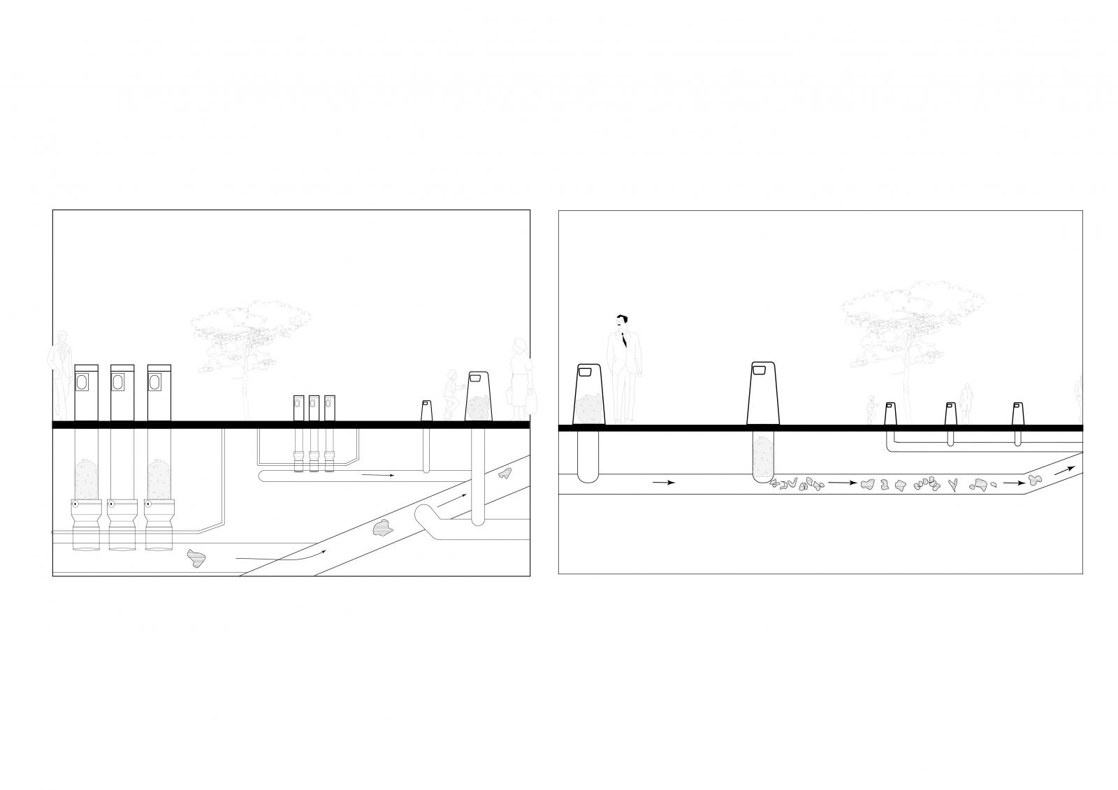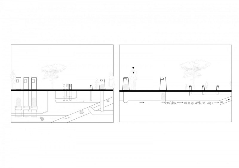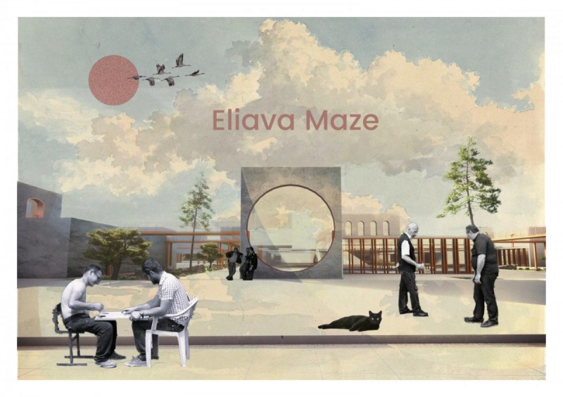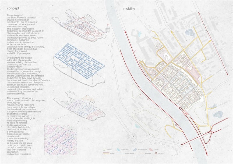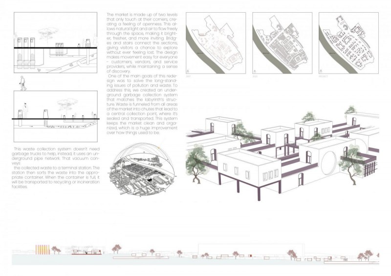 The redesign of Eliava market revolves around the idea of a labyrinth. We chose this concept because it reflects the nature of the market itself a place that’s busy, lively, and full of possibilities but often felt chaotic and overwhelming. By using the labyrinth as a foundation, we’ve created a space that brings order and structure while keeping the excitement of discovery alive. The specific labyrinth we drew inspiration from wasn’t just a metaphor. We took its shapes and paths and used them to plan the market’s layout. The bridges, stairs, and even the underground garbage collection system all follow the same structure as the labyrinth, making everything feel connected and purposeful. The market is made up of two levels that only touch at their corners, creating a feeling of openness. This allows natural light and air to flow freely through the space, making it brighter, fresher, and more inviting. Bridges and stairs connect the sections, giving visitors a chance to explore without ever feeling lost. The design makes movement easy for everyone - customers, vendors, and service providers, while maintaining a sense of discovery. One of the main goals of this redesign was to solve the long-standing issues of pollution and waste. To address this, we created an underground garbage collection system that matches the labyrinth’s structure. Waste is funneled from all areas of the market into chutes that lead to a central collection point, where it’s sealed and transported. This system keeps the market clean and organized, which is a huge improvement over how things used to be. Another problem we tackled was the handling of hazardous materials, especially in areas where car parts and industrial goods are sold. Spill collection cells were added in these zones to safely contain harmful substances, preventing pollution and protecting both people and the environment. Beyond solving practical issues, the labyrinth design makes the market a more enjoyable place to be. A new ventilation system keeps the air fresh and removes bad smells, creating a healthier atmosphere. Open pathways let in natural light, making the space feel welcoming and reducing the need for artificial lighting. The labyrinth isn’t just a pattern for the market’s layout, it’s the backbone of how the whole space works. It shapes how people move, how waste is managed, and how different parts of the market connect. It creates a balance between structure and exploration, offering visitors a sense of adventure while keeping things organized and functional. This redesign is more than a solution to old problems—it is a vision for the future. The new Eliava market is a place where people can explore, connect, and experience something unique. The labyrinth brings structure, sustainability, and excitement, making it a space that serves both the community and the environment.