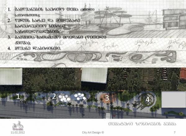 კონცეფცია: 750 მეტრიან მონაკვეთზე შეიქმნა სხვადასხვა ხასიათის მოსასვენებელი სივრცე. სკვერის მოწყობა ითვალისწინებს სარეკრეაციო სივრცეების თემატურ განვითარებას. კომპოზიციის დომინანტურ ნაწილს შეადგენს წყლის სარკე, მის ირგვლივ მოწყობილი მოსასვენებელი კუთხეებითა და საჩრდილობლებით. მის გარშემო თემატურადაა ორგანიზებული: მარჯვნივ ბავშთა სათამაშო მოედანი, წითელი ქვიშით და გამწვანებით შექმნილი ლაბირინთი, ხოლო მარცხნივ _ გამწვანებითა და ბილიკებით შექმნილი მოსასვენებელი სივრცე, რომელიც ორგანულად გადადის ტყის თემატურ სივრცეში, რომელშიც განთავსდება სავალი ბილიკი და მოეწყობა დეკორატიული განათება.