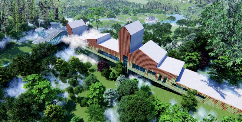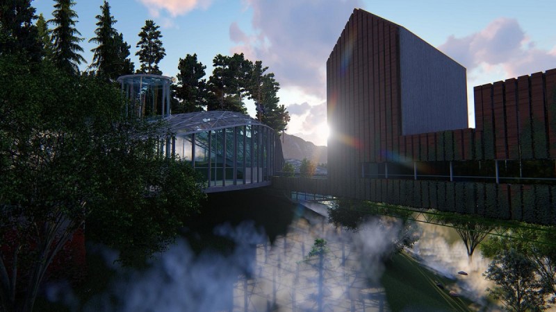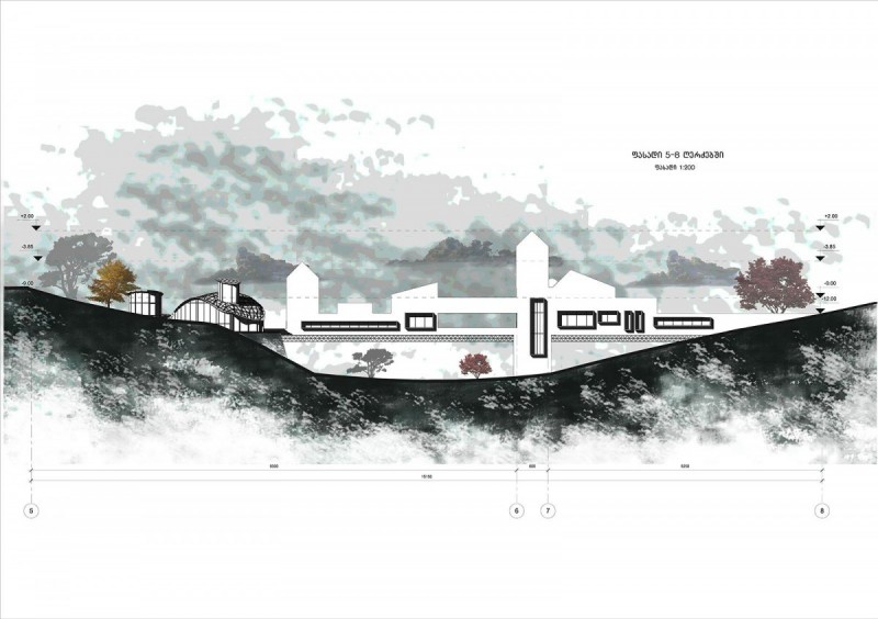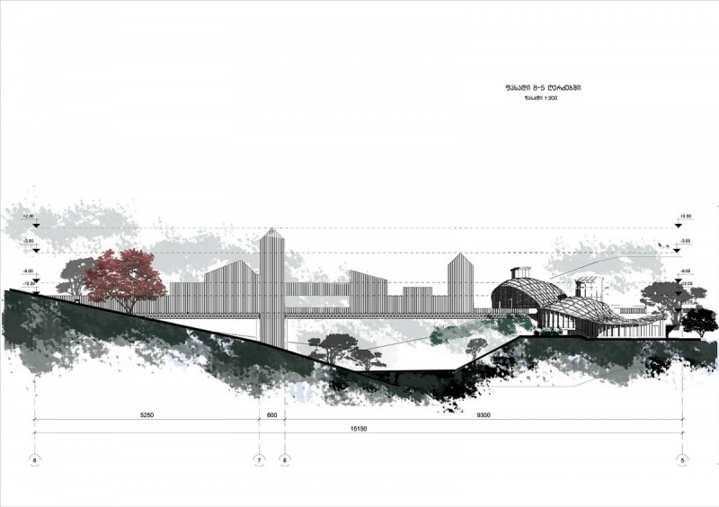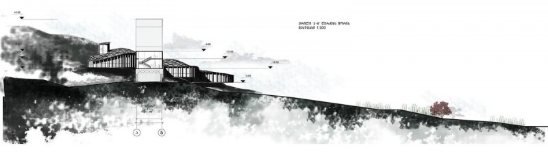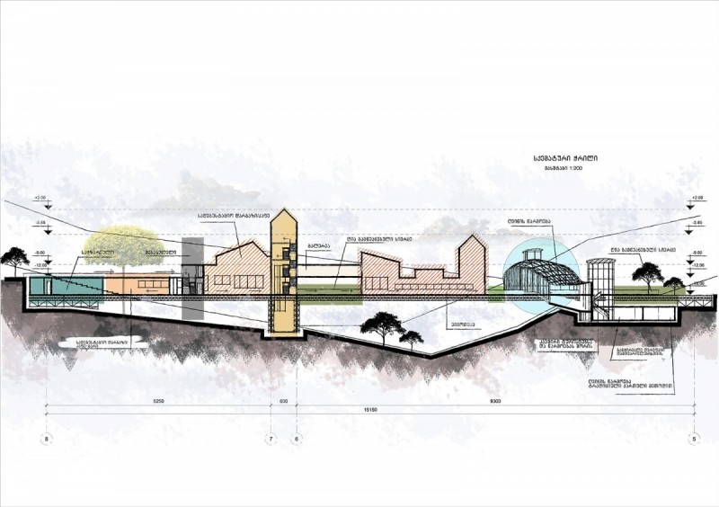 პროექტის აღწერაrnrnrnღვინის სამყაროს საპროექტო ადგილს წარმოადგენს დასავლეთ საქართველო, რაჭა, სოფელი ხვანჭკარა.rnrnrnრაჭა-ლეჩხუმი მდებარეობს დასავლეთ საქართველოსა და ჩრდილო-აღმოსავლეთ ნაწილში - მდინარე რიონსა და ცხინვალის სათავეების მიმართულებით. იგი გარშემორტყმულია მთის ქედებით. საპროექტო ადგილიც სწორედ მდინარე რიონის პირას სოფელი ხვანჭკარის მოპირდაპირე ნაპირის გასწვრივ მდებარეობს. შენობა-ნაგებობის რთული საინჟინრო გადაწყვეტები ადგილობრივი რთული რელიეფიდან გამომდინარე ჩამოყალიბდა. კომპლექსი მოიცავს ორ ძირითად ობიექტს, რომლის ერთი ნაწილიც უშუალოდ ღვინის წარმოებას დაეთმობა, ხოლო მეორე დამთვარიელებლებისთვის იქნება განკუთვნილი. ორი ძირითადი შენობის იერსახე ერთმანეთისგან მკვეთრად განსხვავებული და კონტრასტულია, ისინი დამოუკიდებლად წარმოადგენენ სამრეწველოსა და საზოგადოებრივ სივრცეებს, ჩვეენი მთავარი მიზანიც ამ ორი სივრცის ერთმანეთში ინტეგრირება იყო. rn rnღვინის წარმოებისთვის განკუთვნილი შენობის იერსახე თანამედროვე არქიტექტურას განეკუთვნება. შენობის ძირითადი ნაწილი შემინულია და კონსოლის სახით გადმოდის არსებულ კლდეზე, თუმცა მისი მეორე ნაწილი მთლიანად კლდეშია შეჭრილი და გარედან არ აღიქმება. საწარმო 3 დონედ იყოფა, რომელიც არსებული კდლის რელიეფს მიყვება. ყველაზე ქვედა დონეზე (ძირითადი არსებული გზიდან -20.00 -ზე) ხდება ხიდის სახით სოფელი ხვანჭკარიდან ყურძნის მოსავლის გადმოტანა და შენობის პირველ სივრცეში შეტანა, სადაც ხდება ყურძნის დაწურვა-დაწნეხვა. ყურძნის წვენი შემდგომ სივრცეებში ინაცვლებს მილების საშუალებით. შემდეგი ფუნქციური სივრცე 2 მეტრით მაღლა მდებარეობს პირველთან შედარებით, რომელიც ორ ძირითად ზონად იყოფა: 1. ევროპული სტილით ღვინის დაყენება; 2. ქართული ტრადიციული სტილით ღვინის დაყენება, რომელიც მთლიანად კლდეშია შეჭრილი(მოთხოვნილი პირობებიდან გამომდინარე). ასევე აღსანიშნავია მათ შორის გამავალი ბილიკი რომელიც დამთვარიელებლებისთვის იქნება განკუთვნილი და ვერტიკალური კონტაქტი ექნება დამთვარიელებლისთის მოწყობილ სპეციალურ სოვრცეებთან(კომპლექსის მეორე ნაწილი, რომელიც ხიდის სახით გვევლინება). ბილიკი ორივე მხრიდან შემინული იქნება, რისი საშუალებითაც დამთვარიელებელს შეეძლება ღვინის წარმოების პროცესის ხილვა ისე რომ უშუალოდ ქარხნის დარბაზში შემეთხვევით ვერ მოხვდება. შედეგად ღვინის წარმოება დაცული იქნება გარე არასასურველი ფაქტორებისა და ამავდროულად დამთვარიელებელი სრულად აღიქვამს პროცესს ღვინის წარმ