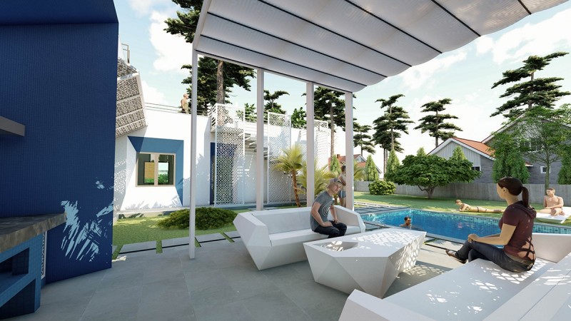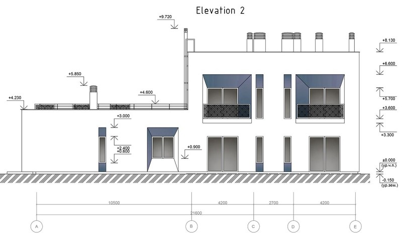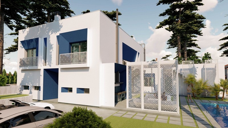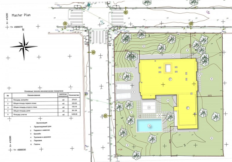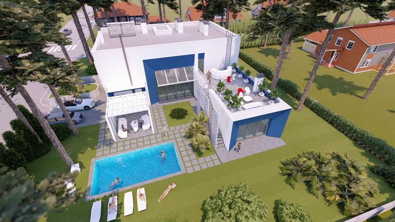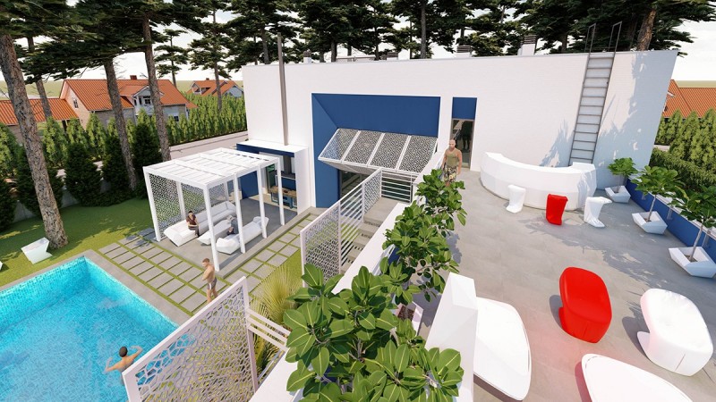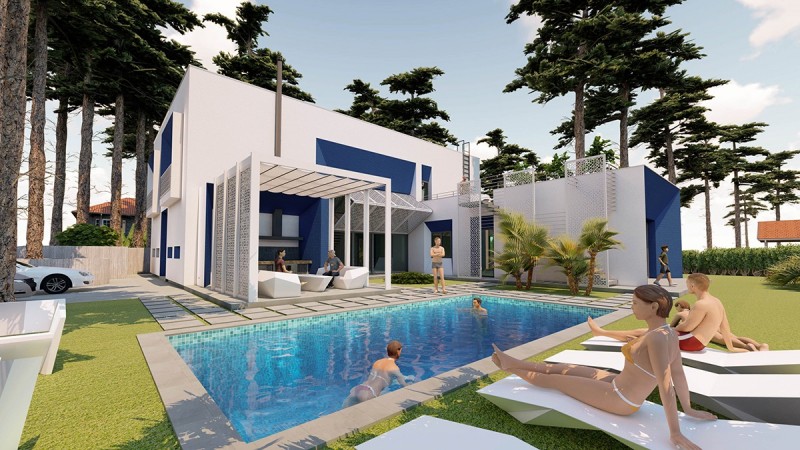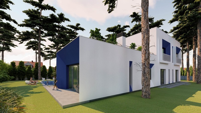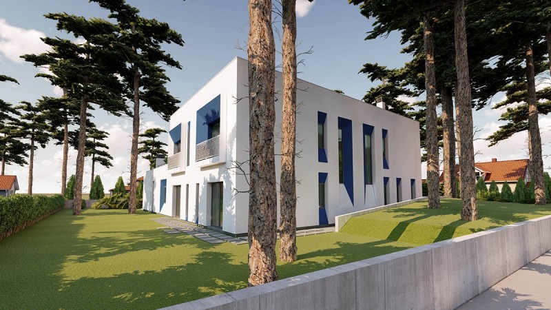 The residential house was designed for a family of six people is designed in a modern style and is a 2-storey main building without a basement and without an attic with a flat roof, which is not exploited, on which the installation of solar collectors for water heating is provided. The building is rectangular in plan. Attached to it is a one-story guest block with an exploited roof terrace with access from the second floor hall of the main part of the building, as well as from the site. Simple but elegant forms of construction provide cost-effectiveness of construction and good thermal characteristics. \\r\\nOn the plot in addition to the house provides a swimming pool and Parking space for 2 cars.\\r\\nIn the exterior decoration is used glass mosaic white and blue (also considered the option of finishing Krion or ceramic granite large format), decorative folding sunscreens.\\r\\nOn the construction site during the design of the maximum preserved existing trees-pines.\\r\\n