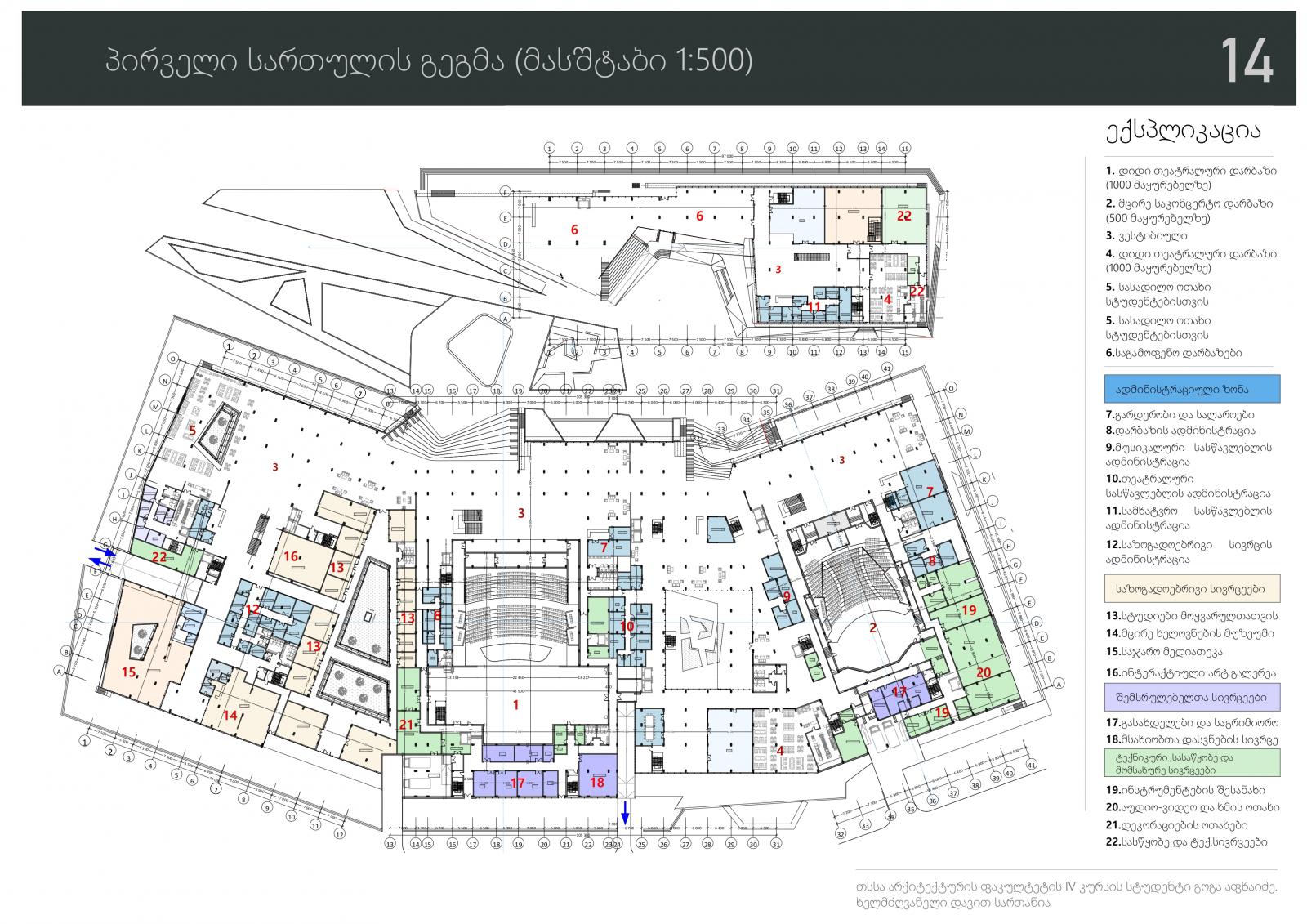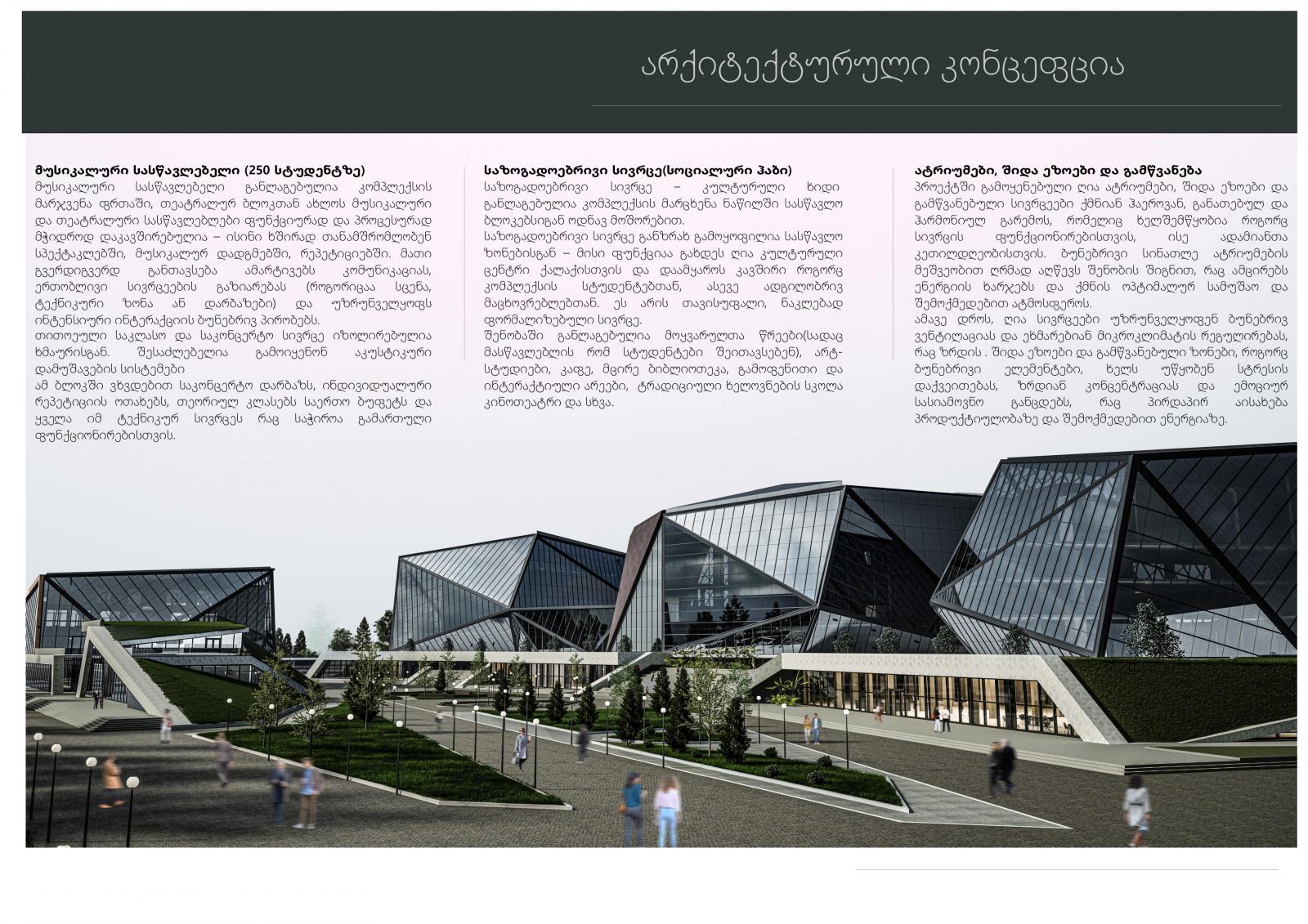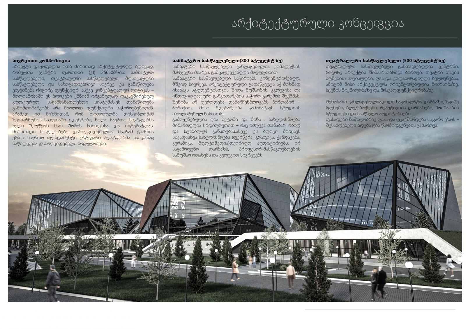 პროექტი წარმოადგენს კულტურულ-საგანმანათლებლო კომპლექსს, რომელიც აერთიანებს სამხატვრო, თეატრალურ და მუსიკალურ სასწავლებლებს, ასევე საზოგადოებრივ სივრცეებს. კომპლექსის მთავარი იდეაა სხვადასხვა სფეროს ხელოვნებისა და განათლების სინთეზი ერთ მთლიანობაში, რაც ქმნის ახალ შესაძლებლობებს სტუდენტებისთვის, მასწავლებლებისთვის და ფართო საზოგადოებისთვის. სამხატვრო სასწავლებელი გათვლილია უმაღლესი განათლების საფეხურზე და მოიცავს საგამოფენო, სახელოსნო და კვლევით ლაბორატორიებს, სადაც სტუდენტებს შესაძლებლობა აქვთ არა მხოლოდ სწავლების, არამედ ექსპერიმენტებისა და ახალი იდეების განვითარებისთვის. მუსიკალურ-თეატრალური ნაწილი აერთიანებს სასწავლო აუდიტორიებს, საკონცერტო და საკონფერენციო სივრცეებს, რეპეტიციისა და რისკენული დარბაზებს, რაც ხელს უწყობს თანამედროვე საგანმანათლებლო და შემოქმედებით პროცესებს. საზოგადოებრივი სივრცეები პროექტის განუყოფელი ნაწილია: ინტერაქტიური არტ-გალერეა, Projection Mapping, AR/VR და სენსორული ტექნოლოგიები, რომლებიც თანამედროვე ინტერპრეტაციით აცოცხლებს ქართულ კულტურას. კომპლექსი იქცევა როგორც განათლების, ისე