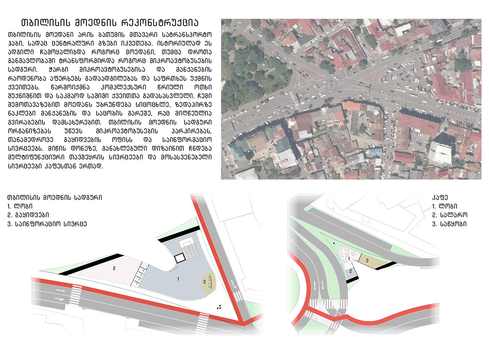 თბილისის მოედანი არის ბათუმის მთავარი სატრანსპორტო ჰაბი, სადაც ცენტრალური გზები იკვეთება. ისტორიულად ეს ადგილი ჩამოყალიბდა როგორც მოედანი, თუმცა დროთა განმავლობაში ტრანსფორმირდა როგორც მიკროავტობუსების სადგური. ჭარბი მიკროავტობუსებისა და მანქანების რაოდენობა აფერხებს გადაადგილებას და საფრთხეს უქმნის ქვეითებს. წარმოიქმნა კომპლექსური წრიული ოთხი შუქნიშნით და საკმაოდ საშიში ქვეითთა გადასასვლელი. ჩემი შემოთავაზებით მოედანს უბრუნდება სიცოცხლე, ზედაპირზე ნაკლები მანქანების და საცობის გარეშე, რაც მიღწეულია გვირაბების დამსახურებით. თბილისის მოედნის სადგური ორგანიზებას უწევს მიკროავტობუსების პარკირებას, თანამედროვე გაყიდვების ოფისს და საინფორმაციო სივრცეებს. მიწის დონეზე, განახლებული დიზაინით ჩნდება მულტიფუნქციური თავშეყრის სივრცეები და მოსასვენებელი სივრცეები კაფესთან ერთად.