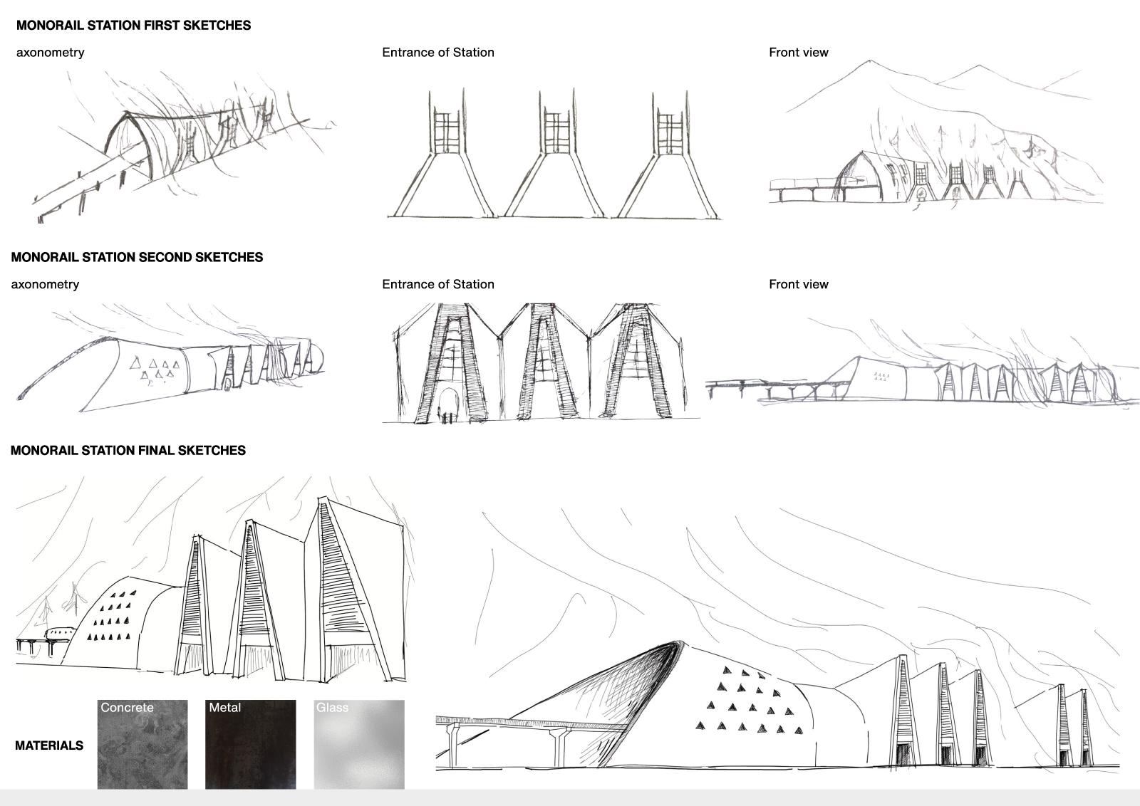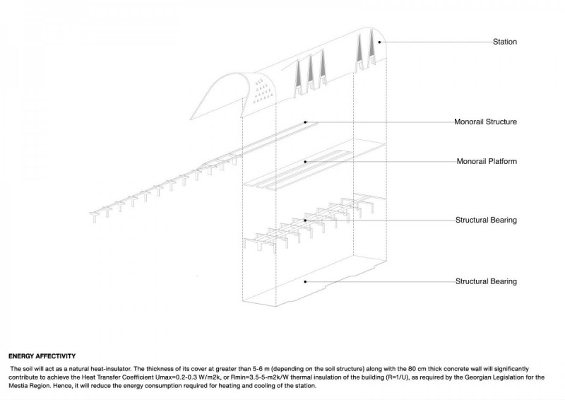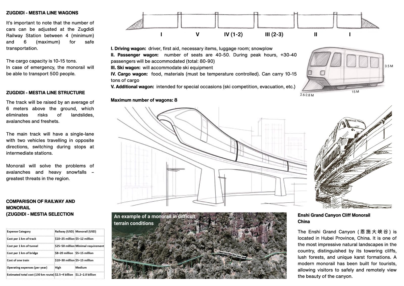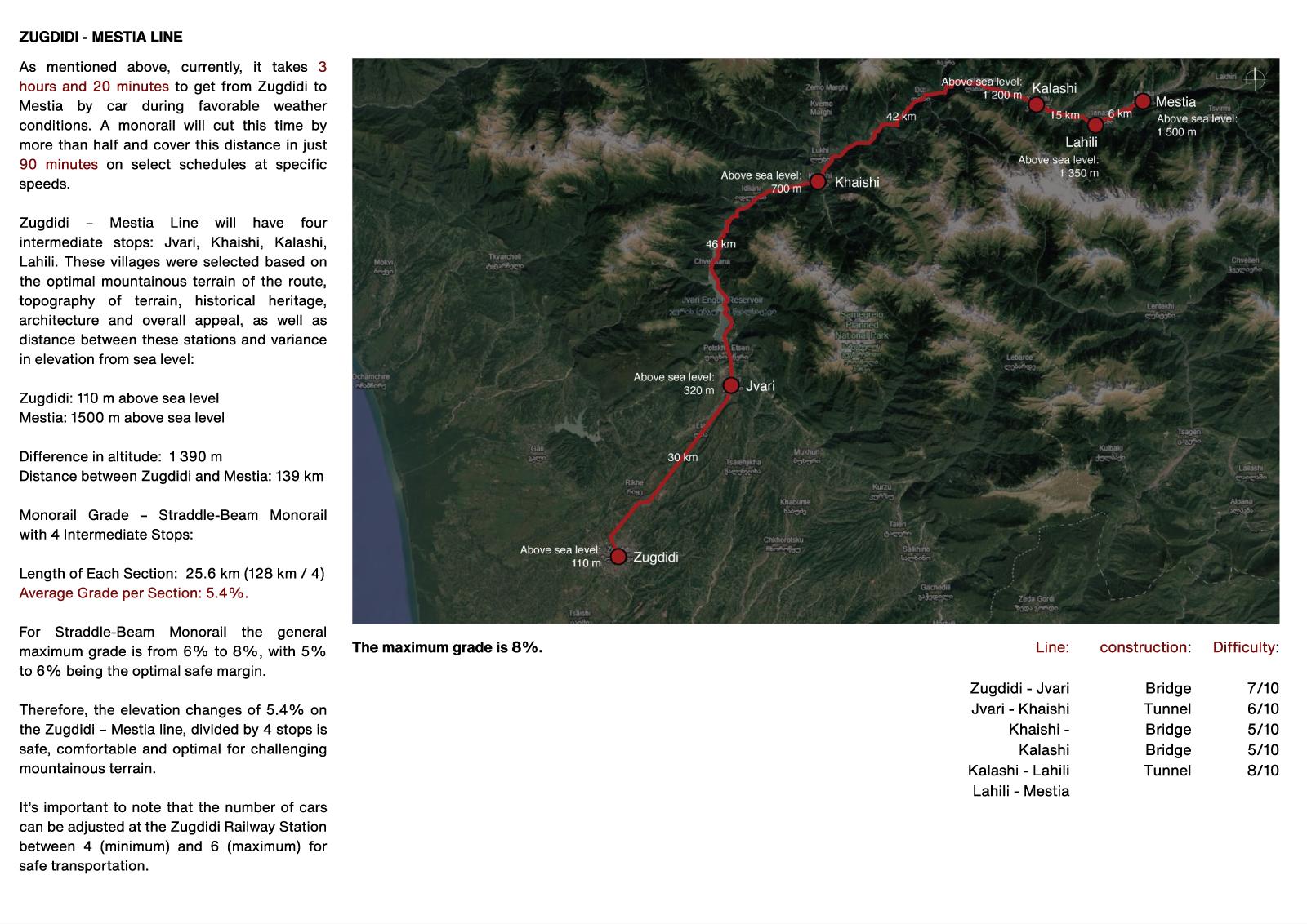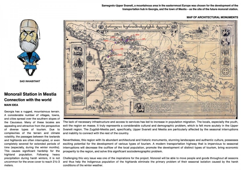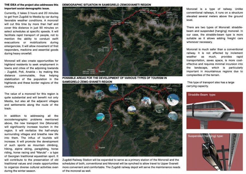 დიპლომის პროექტი მოიცავს ელექტრო მონორეილის სისტემის დაგეგმვას ზუგდიდიდან მესტიამდე, ხუთი გაჩერებით. პროექტი აკავშირებს ორ სამყაროს: მთას, რომელიც ხშირად იზოლირებულია მკაცრი ზამთრის დროს, და ქალაქს. სეზონური მოწყვეტის პრობლემის გადაჭრით, ის მხარს უჭერს მთის თემებს, ამცირებს სოციალურ და დემოგრაფიულ სირთულეებს და აუმჯობესებს ხელმისაწვდომობასა და ტურიზმს. როგორც კავკასიაში პირველი მონორეილის სისტემა, პროექტი წარმოადგენს ინოვაციურ და მდგრად სატრანსპორტო გადაწყვეტილებას. მთავარი არქიტექტურული აქცენტი - მესტიის სადგური - აერთიანებს ადგილობრივ სამშენებლო ტრადიციებს თანამედროვე დიზაინთან, ქმნის კულტურულ და ფუნქციურ ნიშანს, რომელიც აკავშირებს წარსულს და თანამედროვეობას.
